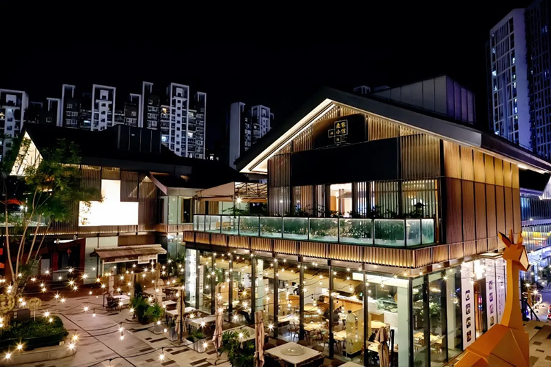 仁安N+的建筑外形是以中空钢化玻璃为墙,深灰色陶瓦为顶,极具颜值与调性。夜间的N+更是一道靓丽的风景,在灯光的搭配下,通透的玻璃房子俨然变成一个个闪亮的水晶盒子。