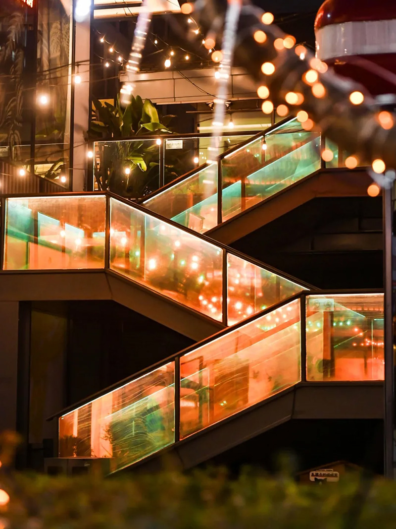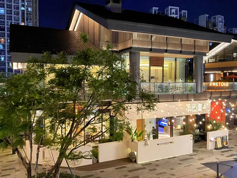 仁安N+的建筑外形是以中空钢化玻璃为墙,深灰色陶瓦为顶,极具颜值与调性。夜间的N+更是一道靓丽的风景,在灯光的搭配下,通透的玻璃房子俨然变成一个个闪亮的水晶盒子。